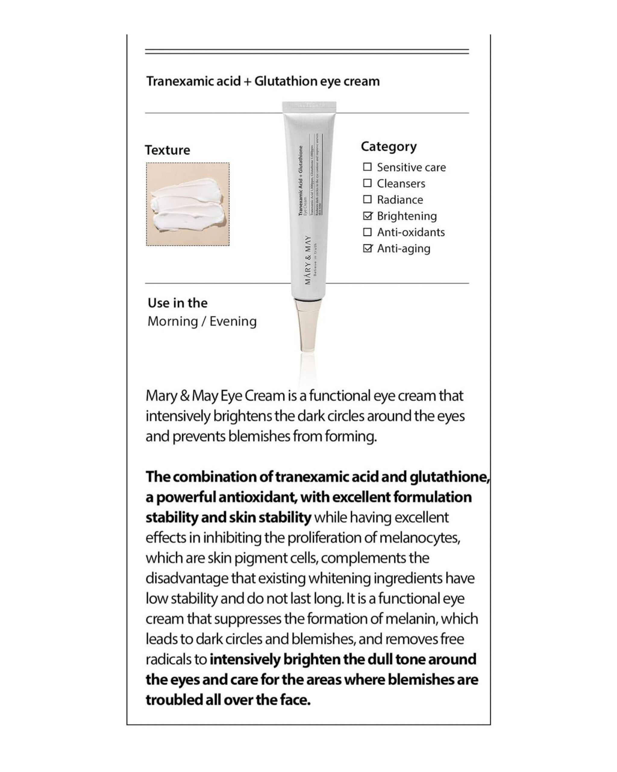 دراین محصول از دو آنتی اکسیدان قوی استفاده شده است که از تکثیر ملانوسیت ها جلوگیری می کنن. ویژگی خاص این دو ماده اینه که برای پوست انسان و پوست حساس ناحیه چشم پایدار و ایمن هستن.